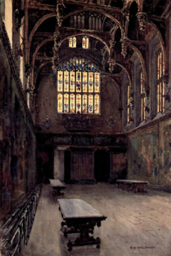 Turning back for a time to Anne Boleyn’s Gateway we may follow the steps up to the Great Hall, and entering from beneath the Minstrels’ Gallery at a doorway through an elaborately carven screen, we see at once before us one of the finest and most impressive of Tudor halls—very similar to but not quite so large as that of Christ Church at Oxford. Whether we look up towards the dais as we enter from under the Minstrels’ Gallery, or whether standing on the dais—raised but a few inches from the general level of the hall—we look back towards the Minstrels’ Gallery and the blue west window above it—it is a grand and pleasing view that we get. The tapestried walls, the high windows, and the fine Perpendicular hammer-beam roof together form a magnificent and pleasing whole, one of the noblest halls of its period that the country has to show. The tapestries, in which are depicted incidents in the life of Abraham—though time has dimmed somewhat the splendour of their colouring—are yet remarkable links with Tudor times, for they were purchased by Henry the Eighth and have remained at Hampton Court ever since the period of their acquisition. Though much restoration was done in the middle of last century the general character of the whole was not interfered with. Then it was that the stained glass was put in—to replace that which had presumably been destroyed during the times “when civil dudgeon first grew high and men fell out they knew not why”—and we may well be grateful that the taste displayed in doing so was on the whole so well displayed, though the garish blue of the western window above the Minstrels’ Gallery is perhaps an exception to that taste. The great oriel window at the southern end of the dais, with the beautiful groining above cannot fail to attract attention, and looking back from the dais down the Hall we may notice the elaboration and richness of the magnificent roof, which is acknowledged to be probably the most splendid roof of the kind ever erected in England.
