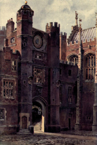 Entering through the Great Gatehouse—where, though the Palace is no longer used as a residence by the royal family, a sentry is always on guard—we reach the First Green Court or Base Court—a peaceful quadrangle surrounded by low red buildings with the western end of the Great Hall fronting us to the left. This, the only turfed “quad”, is the largest of them all. In the surrounding rooms are supposed to have been many of the chambers which Wolsey allotted to his guests when they came in such numbers as are indicated in the passage already quoted from Master George Cavendish. Opposite us is the end of the Great Hall to the left, and directly in front is the clock gatehouse on either turret of which is to be observed one of those terra-cotta plaques of the Roman Emperors which were at one time thought to have been the work of Della Robbia, and to have been presented to Wolsey when he was building, but which Mr. Law has shown to be the work of Joannes Maiano and to have been ordered by the Cardinal. This gate is known as Anne Boleyn’s Gateway, in the groined ceiling (restored) of which as we pass beneath are to be noticed around a central Tudor rose the monograms of that unhappy Queen, Henry the Eighth, and “T. C.” repeated alternately with them—the last-mentioned initials may well puzzle the visitor who does not know that they stand for Thomas Cardinal, a designation which Wolsey was fond of employing.