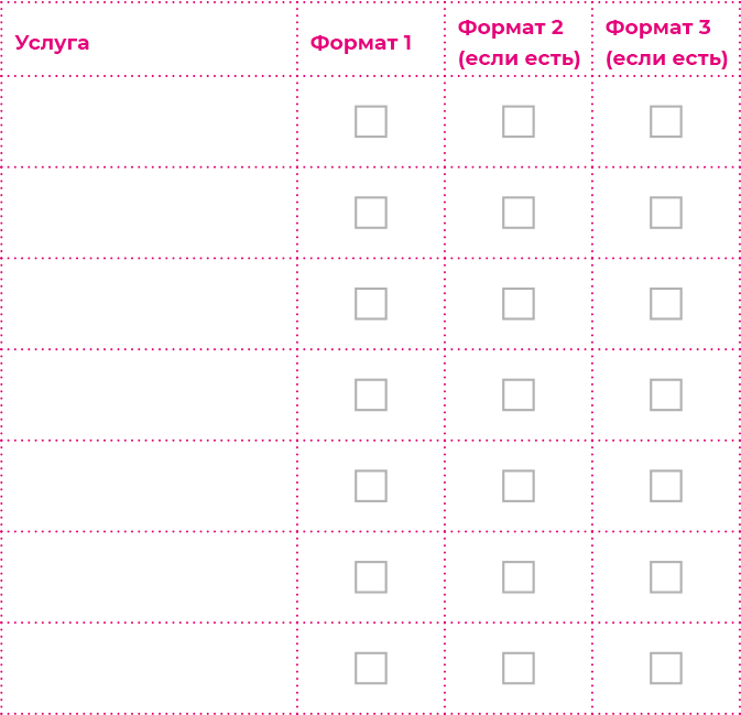 Если вы понимаете, что в вашем бизнесе франшиза может продаваться одновременно в нескольких форматах, — запишите их в соответствующих колонках. Например, франшиза суши-бара может продаваться в трех форматах: «Только доставка», «Остров в торговом центре», «Ресторан». И для каждого из этих форматов потребуется разный набор услуг. Просто поставьте галочку напротив соответствующего вида услуги, если она будет предоставляться в этом формате. Для разных форматов услуги могут как отличаться, так и быть абсолютно одинаковыми.