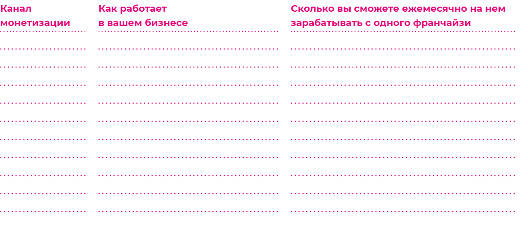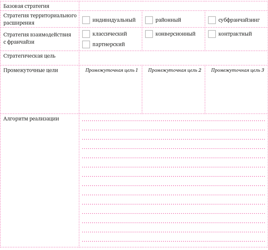 Концепция франшизы — ключевой документ, который определяет стратегию продвижения и продаж (раздел 2), структуру руководства франчайзи, построение управляющей компании, характер взаимодействия с франчайзи, стратегию расширения — все те блоки, которые вы проработаете в этой книге. Концепция франшизы позволяет составить уникальное, конкурентоспособное предложение для франчайзи, быстрее достичь своих целей и минимизировать затраты на привлечение партнеров.