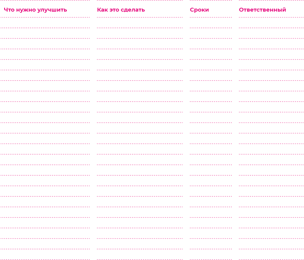 Чтобы ваши усилия по оценке бизнеса не пропали втуне, заполните эту таблицу — она станет вашим чек-листом, по которому вы будете готовить свою компанию к франчайзингу. Заполните ее и не откладывая в долгий ящик поставьте задачи соответствующим исполнителям.