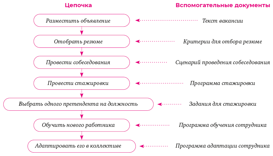 В идеале каждый ваш бизнес-процесс описывается в виде логической цепочки. Из нее любому должно быть понятно, какие ресурсы необходимы для осуществления процесса, с чего он начинается, как продолжается и чем заканчивается, а также каким должен быть его результат.