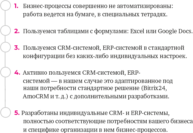 Теперь оценим, автоматизированы ли ваши бизнес-процессы. Для этого используются такие программные решения, как CRM-система и ERP-система.