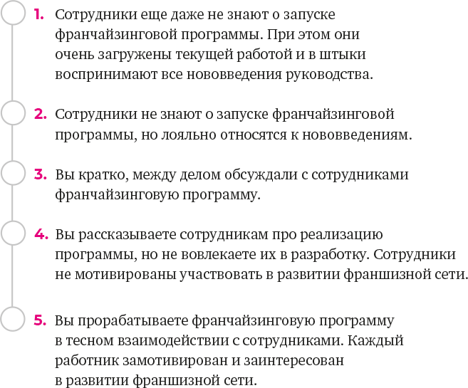 Сотрудники вашей компании — это именно те люди, на которых с появлением франшизы ложатся новые обязанности. Готовы ли они взять на себя эти обязанности? Есть ли у них мотивация — и материальная, и нематериальная, — чтобы заниматься франчайзингом?