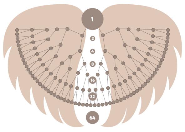 Описанная практика помогла мне понять, какую огромную силу несет человеку его род, ощутить энергетическую связь с ним. Если изобразить схематично 126 человек, то получатся два крыла, символизирующие эту силу. Каждый ушедший родственник играл свою роль в жизни рода, внес свою лепту в его становление, оставил свой след на земле. Между всеми представителями рода существуют незримые связи, и независимо от того, как много нам известно об истории семьи, каждый предок незримо присутствует в нашей жизни через опыт, семейные традиции, гены и т. д.