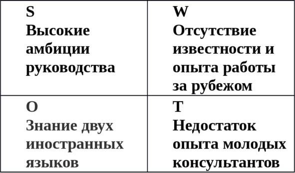 W – слабая сторона компании. Отсутствие известности и опыта работы за рубежом. Отмеченная слабая сторона отдаляет реальную возможность для привлекаемых специалистов зарабатывать конкурентоспособную заработную плату. Есть вероятность, что высокие амбиции компании в желательный период времени не осуществятся. Это, несомненно, будет играть отрицательную роль для привлечения опытных консультантов, кто хотел бы связать свою карьеру с нами, но не уверен в реализации своих личных амбиций при работе в составе нашего центра.