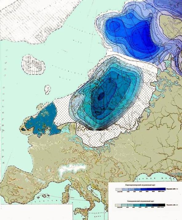 Paleogeographers note a number of features of this region. «A characteristic feature of the history of this (Barents Sea) cover was the very rapid rate of decay, which began, however, relatively late,» and had the appearance of destruction and fragmentation of the glacier. As noted above, detailed studies have shown that «the degradation of the last ice sheet of the Pechora lowland, as well as the entire North-East of the European territory of the USSR, occurred in an unusual way, fundamentally different from the degradation of the Scandinavian ice sheet. Its destruction was accompanied, and possibly caused by the process, seismic in nature, i.e. earthquakes». But the power of these earthquakes had to reach at least 12 points in the vast area from Pechora to Spitsbergen; otherwise they simply would not have been able to destroy a glacier with an area of 2 million square kilometers with 4 million cubic kilometers of ice. In modern science, the question remains open, what could have caused such catastrophic earthquakes in this tectonically calm area, moreover, balanced then by three kilometers of ice, dampening fluctuations in the lithosphere crust (the glacioisostatic trough reached at least 150—170 m.). In the edge part of the glacier, the ice thickness was also significant — not less than 450—700 m.