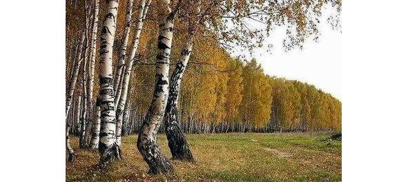 Between birches — slanting rains.