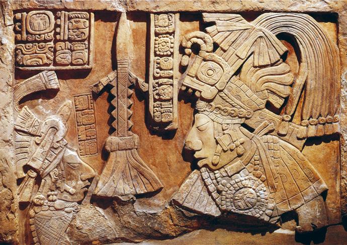 ↑ Правитель Пачанского царства цивилизации майя Яшун-Балам IV, известный как Птица-Ягуар, и женская фигура, оба в военном облачении. Резной известняковый барельеф майя в Якшилане, Мексика. Ок. 770 г. н.э.