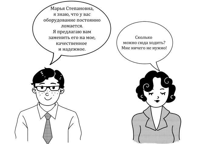 «Марья Степановна, я знаю, что у вас оборудование постоянно ломается. Я предлагаю вам заменить его на мое, качественное и надежное».