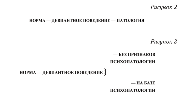 Широкая область научного знания охватывает аномальное, отклоняющееся, ненормативное, девиантное поведение человека. Существенным параметром такого поведения выступает отклонение в ту или иную сторону с различной интенсивностью и в силу разнообразных причин от поведения, которое признается нормальным и не отклоняющимся. Существует представление о том, что девиантные формы поведения — это переходные, неразвернутые варианты поведенческой психической патологии. И основным принципом их диагностики следует признать, с одной стороны, отсутствие качеств поведенческой нормы, с другой — отсутствие психопатологических симптомов (рисунок 2). Однако более адекватным представляется обозначение как девиантного любого отклоняющегося от нормы поведенческого стереотипа (как собственно девиантного — без признаков психической патологии, так и поведенческих эквивалентов психических расстройств и заболеваний) (рисунок 3).