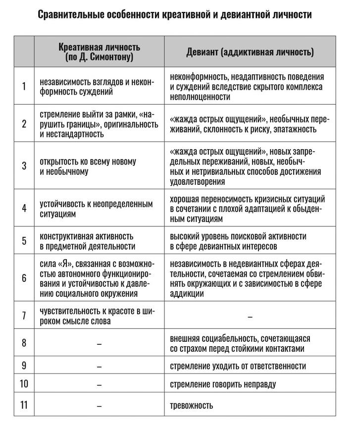 По Д. Симонтону, у творческой личности можно выделить семь базовых векторов. Их сопоставление с критериями диагностики аддиктивного типа девиантного поведения указывает на существенную близость этих разновидностей поведения (таблица 1).