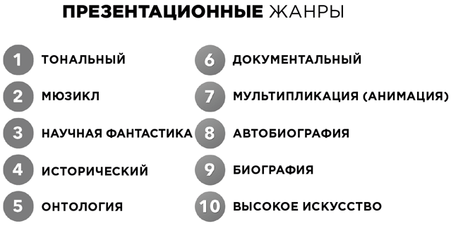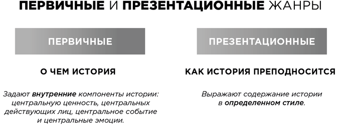 Уточним, что жанры — это оболочка, обеспечивающая истории внешнюю форму. Автор выбирает из разных жанров, как композитор выбирает из классики, джаза, рока, хип-хопа, а потом из вокального или инструментального соло, ансамбля, оркестра, решая, что из этого лучше выразит его мелодию. Для писателя этот вопрос формулируется так: какой из первичных жанров лучше воплотит мою идею? Какой из презентационных жанров лучше всего донесет ее до аудитории?