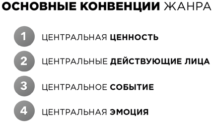 Каждый первичный жанр содержит четыре основные конвенции — это центральная ценность, центральные действующие лица, центральное событие и центральная эмоция.