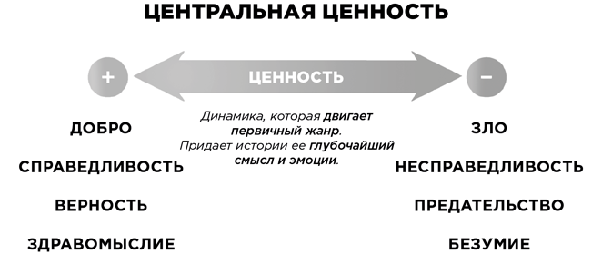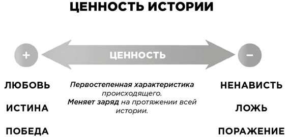 Ценность истории — это ожившее противопоставление положительного заряда отрицательному: истина/ложь, любовь/ненависть, свобода/рабство. События в истории могут замешиваться на динамическом моральном парадоксе (добро/зло), социальной дилемме (справедливость/несправедливость), личном конфликте (преданность/предательство) или душевном расстройстве (здравомыслие/безумие). На протяжении любой истории самые глубокие эмоции вызывает именно центральная бинарная ценность. По мере того как она меняет заряд с положительного на отрицательный и обратно, персонажи одерживают победы и поражения, страдают и выходят живыми из испытаний, и история движется к кульминации и развязке.