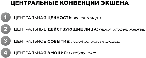 В следующих четырех главах мы подойдем к этому выбору вплотную, рассматривая четыре краеугольные составляющие экшена — центральных действующих лиц, центральную ценность, центральную эмоцию и центральное событие.