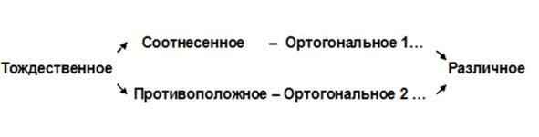 На представленном ранее Рис. 1, отражающем развитие познания, показано, что освоение структурного многообразия мира идет в направлении от тождества к различию, что связано с отождествлением все более непохожих свойств реальности. Подобно становлению числового ряда, оно идет через нахождение следующих друг за другом сравнительных понятий, лежащих между предельными абстракциями отождествления и различения: «соотнесенное», «противоположное», «ортогональное», «дополнительное», «подобное», каждое из которых появлялось вслед за предыдущим и обуславливало собой революцию в познании.