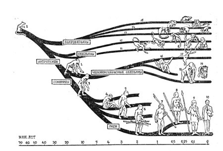 Антропоїди, в свою чергу, розділилися на людиноподібних мавп і гомінід. До людиноподібних мавп належать довгорукі орангутанги, гібони, горили та шимпанзе. Вони можуть досить моторно пересуватися по землі. Тіло їх напівзігнуте, тому вони мають спиратися на передні кінцівки. Гілка гомінід розділилася на безліч інших, серед яких найбільш відомі дріопітек, рамапітек, австралопітек та ін. Це були вже прямоходячі істоти. Їхній мозок перевершував за розмірами мозок шимпанзе і горил, і вони вже переступили поріг, за яким починалися перші ознаки примітивної культури. Але тільки один вид з цього пучка гілок, що виникли було на генеалогічному древі, призвів до появи гомо сапіенса, тобто людини розумної. Отже, як бачимо, людина — лише одна з безлічі гілок великого дерева приматів, а мавпи — скоріше наші далекі родичі, аніж предки.