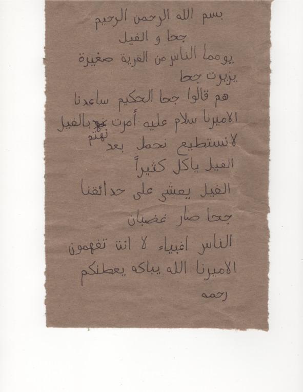 Отвечал им Ходжа Насреддин: «О, неразумные жители деревни! Вы сами не знаете, о чем просите! Аллах да накажет вас за ваше неразумие! Наш эмир (да продлит Аллах его дни) оказал вам великое благо, прислав вам своего слона! Горе вам, если вы этого не поняли!»