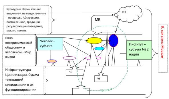 Последнее, что надо учитывать, как не явную, обычно забываемую особенность для понимания. Человечество, строится на антропоцентризме и ядре антропоцентризма — себялюбие. То есть, воспринимает всё и строит картину мира через неизменную конструкцию минимального элемента общества — индивидуума. При этом забывая, что человек развивается через накопление и обобщение актуальной информации в надличностном слое общества, как инфраструктуры институтов общества, или Вторых Субъектов (от школ до институтов науки, социума, экономики, политики в атмосфере национальной культуры… когда общество дорастает до нации). Иными словами, чем большим объемом и качеством осмысленной информации овладевает человек, чем выше уровни институтов его общества, стоящего на ступени высокой культуры, стремящейся в своём развитии к уровню «цивилизация «Омега», тем больше и сила правды этого общества. Конечно, идеал общества, как формат — цивилизация «Омега», не потому, что оно будет обладать всем комфортом жизни и всеми условиями для развития человека, с полнотой информации о бытие и иметь самые совершенные способы ее обработки, а потому, что этика, мораль достигнет такого уровня, что человечество в своём развитие преодолевает стену, в которую оно упёрлось сейчас — «не нравственность» (по Ф. М. Достоевскому).