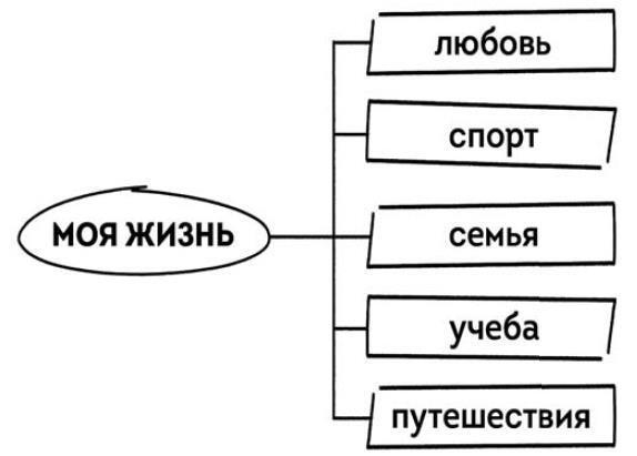 Теперь от центра нарисуй ответвления – ключевые области своей жизни. У каждого человека они будут разные: у одного музыка, танцы и ведение блога, у другого – футбол, волонтерство и подготовка к поступлению в университет.