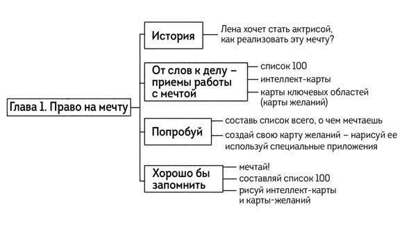 Если тебе понравилось рисовать такую карту, можешь использовать ее и для других задач: например, если захочешь набросать план своего спортивного развития или продвижения блога, подготовиться к пересказу длинного текста, написанию опорного конспекта или сочинения. Смотри, вот так выглядит интеллект-карта первой главы этой книги: