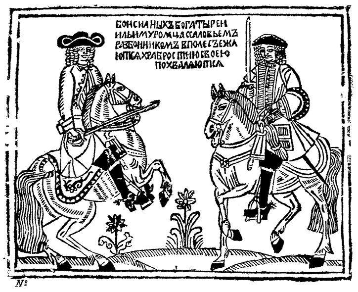 Поединок богатыря Ильи Муромца с Соловьем-разбойником (аллюзия на Петра I и Карла XII). Ксилография. Первая половина XVIII века