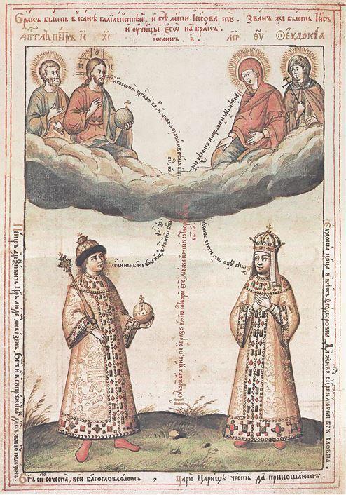 Петр I и Евдокия Лопухина. Иллюстрация из книги иеромонаха Кариона Истомина «Книга любви знак в честен брак», преподнесенной в 1689 году в качестве свадебного подарка Петру Первому