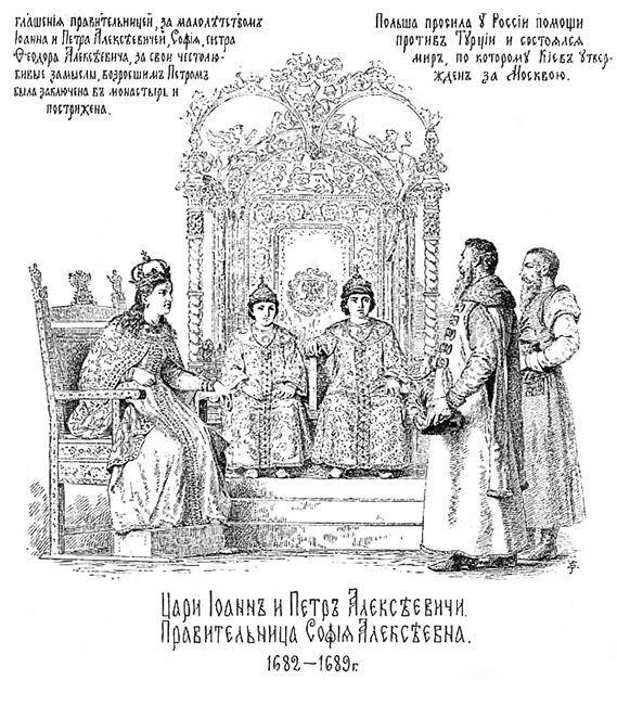 Софья в государственных бумагах присоединила свое имя к именам обоих братьев, вместе с ними называлась самодержицею всея Руси. Дьяк Волков, отправленный посланником в Венецию, объявил там, что с великими государями соцарствует сестра их, великая государыня Софья Алексеевна. Один из сенаторов заметил: «Дож и весь сенат удивляются, как служат их царскому величеству подданные их, таким превысоким и славным трем персонам государским?» Волков отвечал, что подданные всех трех персон вместе повеление исполняют. Но все эти провозглашения не крепки, все это не помазание.