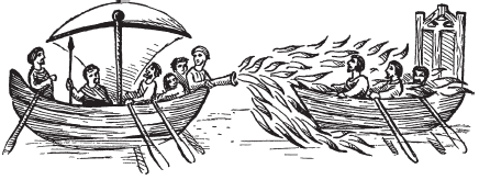 Маленькие ручные сифоны могли быть двух типов. Один источник сообщает о шаре, который выбрасывался из длинной пустотелой трубы и на выходе из нее зажигался от запального огня, в то время как другой автор описывает снаряд, приводимый в движение воздухом. Мехи, духовые трубы, устройства наподобие спринцовки – все это, по-видимому, годится для выбрасывания огня, однако решить, что же в действительности имели в виду авторы этих описаний, затруднительно, а причудливые рисунки того периода, изображающие «огненосные» корабли в действии, не помогают прояснить этот вопрос. Вот иллюстрация морской битвы, показывающая корабль с орудием, изрыгающим огонь, который окутывает вражеское судно пылающим облаком. Рисунок заимствован из греческого манускрипта Скилиция, однако из него мало что можно понять, поскольку находящийся на носу корабля «огнеметчик», или, по принятой тогда терминологии, «сифонатор», изображен склонившимся к своему аппарату и держащим одну руку на его трубе, в то время как его взгляд направлен куда-то в сторону.