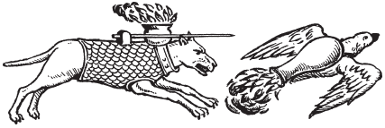 Джон Арденн, хирург эпохи Эдуарда III, предложил, помимо длинных боевых луков и арбалетов, применявшихся для метания зажигательных материалов, использовать также птиц и животных для переноски огненных составов в железных или медных сосудах. В рукописи, хранящейся в коллекции Хауслауб в Вене, изображена собака в кольчужной попоне с притороченной пикой и пылающим горшком на спине, скачками несущаяся навстречу врагу. Там же изображены кошка и летящая птица, принужденные к выполнению этой опасной и «малоприятной» службы.