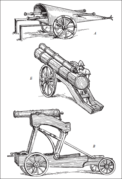 Рис. 1. A – пушечная повозка, 1544 г. Б – пушка под названием «Политика», 1544 г. В – лафет с подъемным механизмом, XVIII в.