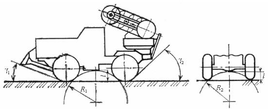 Проходимость через неровности, ширина которых соизмерима с колеёй машины, определяется поперечным радиусом проходимости R2.