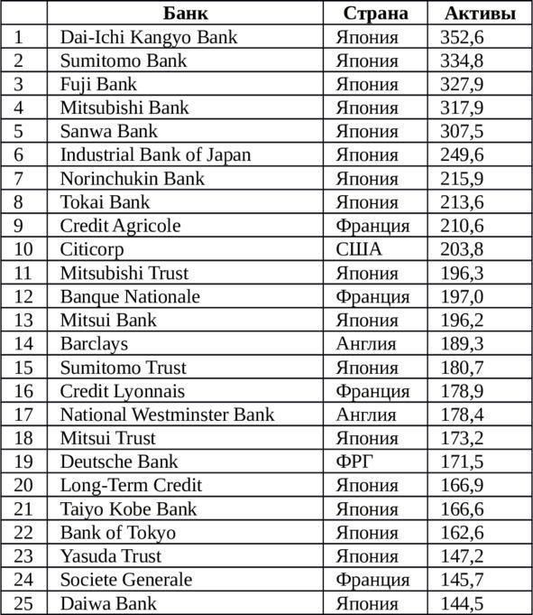 Как показывает таблица, к концу 1980-х годов, из 25 крупнейших в мире банков 17 были японскими. И это даже не считая японской почтовой системы, в которой предпочитала сберегать свои деньги достаточно крупная часть населения Японии (подробнее в главе 2.3.2 ниже).