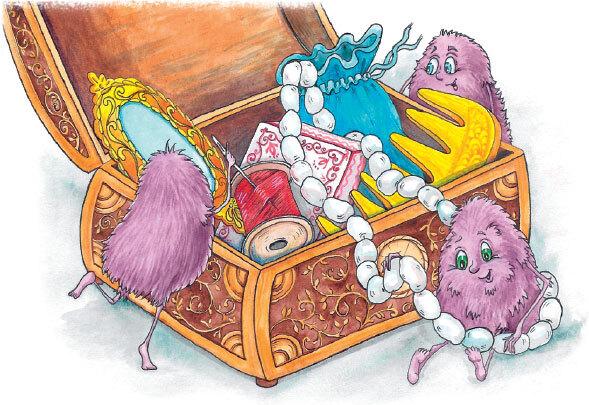 Вовка потянул на себя бронзовую ручку с завитушками. Комод скрипнул и нехотя поддался. Вовка заглянул внутрь. В глубине ящика стояла шкатулка. Он вытащил её и поставил на стол, любуясь резными узорами на крышке. Домовушки тут же окружили шкатулку, потирая лапки. Кот уверенно откинул крышку. В шкатулке лежали расписная коробочка с надписью «Магические предсказания», гребень, зеркальце, катушка красных ниток с иголкой и бархатный мешочек. Кот подцепил мешочек когтем и отдал мальчику: