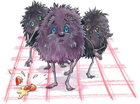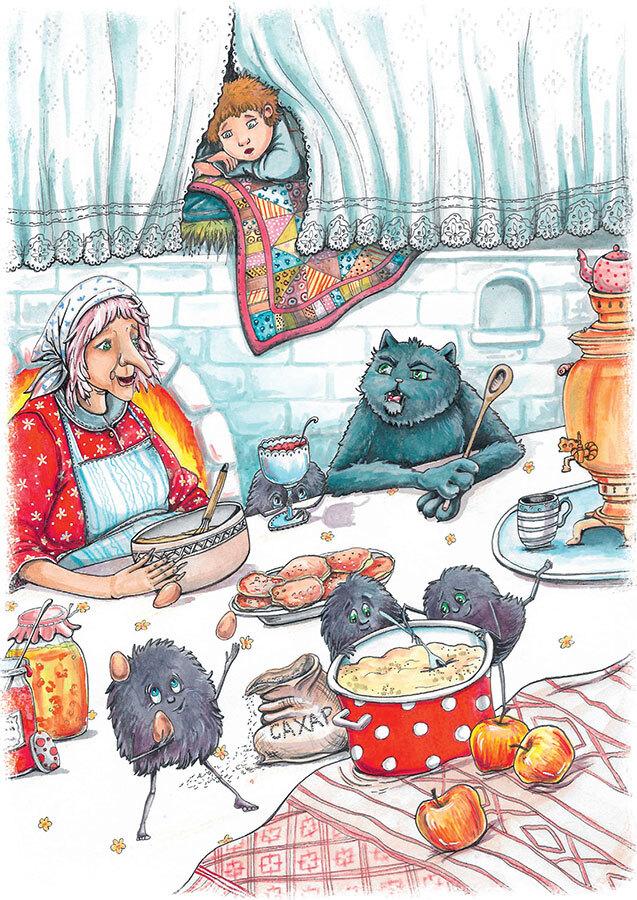 Вовка тихонечко свесил голову с печки и выглянул из-под кружевной занавески. Бабушка в кухне была одна. Почти. На табуретке сидел кот, а на столе и вокруг суетились какие-то чёрные пушистые кругляши размером с котёнка. У них были тоненькие, похожие на лапки, ручки и ножки. Одни сыпали в миску муку, другие сахар, кто-то размешивал тесто, стуча ложкой, кто-то подметал под столом мусор.