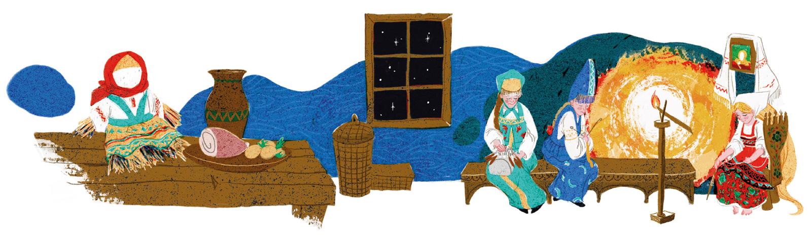 — Что теперь нам делать? — говорили девушки. — Огня нет в целом доме, а уроки наши не кончены. Надо сбегать за огнём к Бабе-яге!