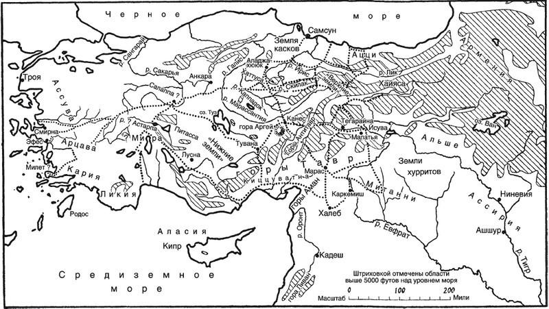 Река Кызылырмак, которую античные ученые называли Галисом, а хетты, вероятно, Марассантией, берет начало в восточных горах и на довольно протяженном участке течет на юго-запад, но вблизи Соленого озера поворачивает, огибая один из поперечных хребтов. Описав таким образом большую петлю, она меняет направление течения на противоположное и, прорезав северные горы в направлении на северо-восток, впадает в Черное море. Интересующая нас территория – область расселения хеттов – занимает излучину в среднем течении Галиса и равнину к югу от озера Туз. Со всех сторон эту местность окружают горы: к востоку от нее находятся Антитавр и Армянское нагорье, к югу – Тавр, а к западу и северу – горные кряжи, не образующие цельного массива. Приморских земель на севере и юге хетты со временем лишились, а западной частью полуострова долгое время, хотя и с перерывами, владело, по всей вероятности, соперничавшее с хеттами царство Арцава.