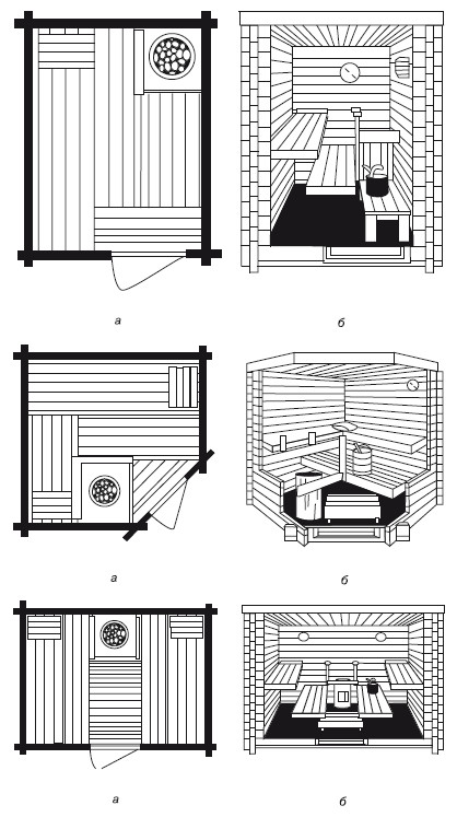 Рис. 1.2. Интерьер сауны: а – вид сверху; б – вид сбоку