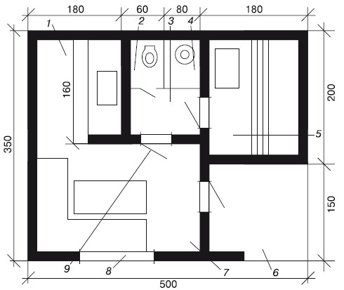 Давайте рассмотрим три примерных банных проекта. Сразу оговорим обязательные условия совмещения банной постройки со всем жилым массивом: качественное выполнение гидроизоляции, продуманная вентиляционная система, грамотное расположение канализации и, разумеется, соблюдение норм противопожарной безопасности. Важно не только устроить комфортабельную баню, но и пользоваться ею так, чтобы не уменьшить ненароком срок службы всего дома, не сделать его сырым. С этой целью, например, не усердствуйте, обильно поливая камни водой, и затем не допускайте их чрезмерного охлаждения. Если баня пристроена к жилому помещению, особенно важно, чтобы воздух в ней был сухим и горячим, а также чтобы по окончании парения баня хорошо высыхала.