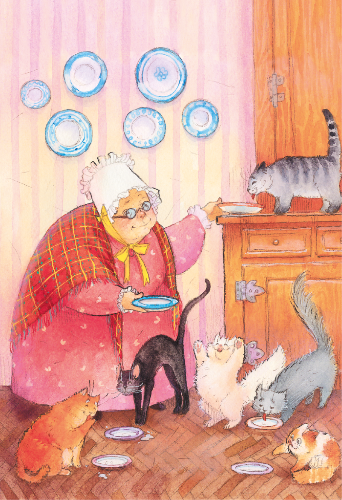 У старенькой мисс О’Шуз жили шесть кошек – чёрная, белая, рыжая, серая, дымчатая и трёхцветная. На кухне их каждый день ждали шесть мисочек, наполненных в обеденное время хозяйкой молоком или рыбой. Кошки ели с большим аппетитом и всегда просили добавки. Как-то раз после обеда все шесть кошек сидели возле своих мисок и умывались.