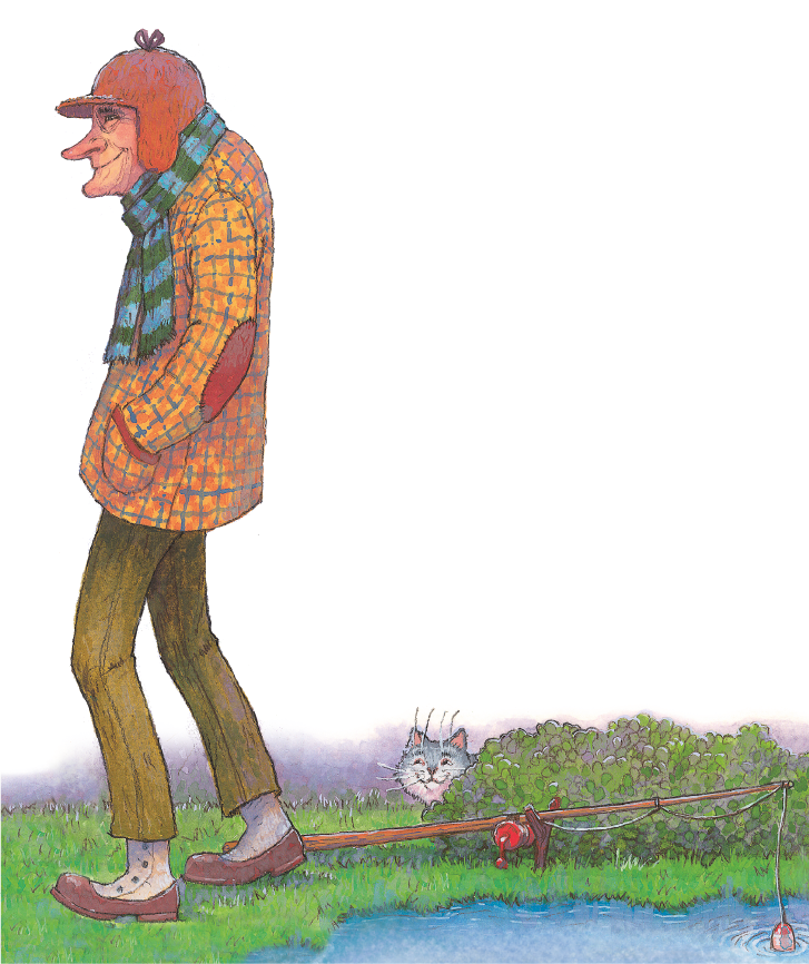 – Я знаю! – мяукнула дымчатая кошка. – Рыбки живут в реке, которая течёт за нашим домом. Нужно только перелезть через изгородь в саду и перейти зелёный луг, где живут мышки-полёвки. Как-то раз я добралась до реки и увидела на берегу пожилого джентльмена с длинной удочкой. Он сидел и смотрел на поплавок, пока тот не ушёл под воду. Тогда пожилой джентльмен выдернул удочку, и на крючке у него оказалась серебристая рыбка.