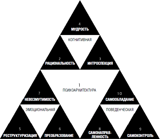 Процесс психоархитектуры и структура последующих глав организованы по принципу триады: когнитивной, эмоциональной и поведенческой. Когнитивная сфера имеет дело с убеждениями и искажениями, самоанализом и мудростью. Эмоциональная – с механизмами приспособляемости, чувствами и желаниями. А поведенческая сфера рассматривает действия, соблазны и привычки. Такое же разделение мы наблюдаем в работе Декарта, где он обозначил цели идеальной жизни.