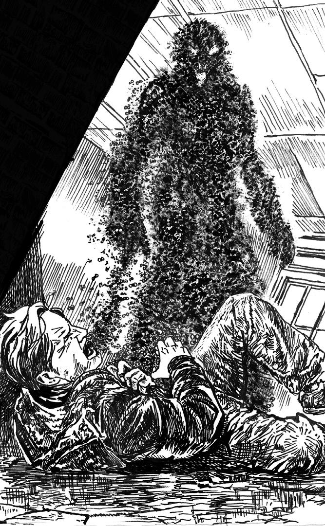 Он выбрал самую темную и, пожалуй, самую маленькую комнату, с единственным узким окошком и влажным деревянным полом. Сел, привалившись спиной к стене, вытянул ноги и хотел было снова закрыть глаза, но противные мухи стали лезть в лицо, садиться на кожу, жужжать будто бы уже прямо в мозгу, заглушая поезда. Андрей сперва отмахивался, но потом понял, что происходит что-то странное. Крылатых тварей становилось все больше, больше и больше, они не просто летали вокруг, а роились, и рой постепенно сгущался, превращаясь в одно целое — жуткий черный силуэт прямо напротив Андрея. Через пару секунд уже можно было различить нечто вроде головы, тело, руки и ноги. Существо сидело у противоположной стены в той же позе, что и Андрей. Выглядело так, будто мухи вылепили его отражение или тень, объемную и живую. Андрей пошевелил рукой — и Оно тоже пошевелило. Андрей кивнул, покачал головой из стороны в сторону — и Оно повторило его действия. Андрей открыл рот, чтобы спросить… Но голос не послушался, и он закашлялся, отхаркивая мокроту, которая забила всю глотку. А Оно так и смотрело на него всеми своими мухами, не шевелясь больше и не повторяя за Андреем его судорожного кашля.