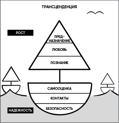 На деле же, как Скотт уже подробно описывал в книге «Путь к самоактуализации», сам Маслоу никогда не рисовал эту пирамиду потребностей [2]. Форма пирамиды подразумевает, что для завершения очередной стадии мы должны, не оглядываясь назад, подниматься на некую метафорическую гору и лишь затем нам откроется следующий уровень возможностей, но это в корне противоречит самой сути человеческого существования. Маслоу подчеркивал, что мы находимся в непрерывном процессе созревания и этот процесс зачастую подразумевает два шага вперед и шаг назад. Эволюция человека не предполагает единого пункта назначения, к которому следует стремиться; это опыт. И чтобы провести нас через этот опыт роста, Скотт предложил новую гибкую и функциональную метафору — парусник, — которая поможет нам понять конфигурацию основных человеческих потребностей.