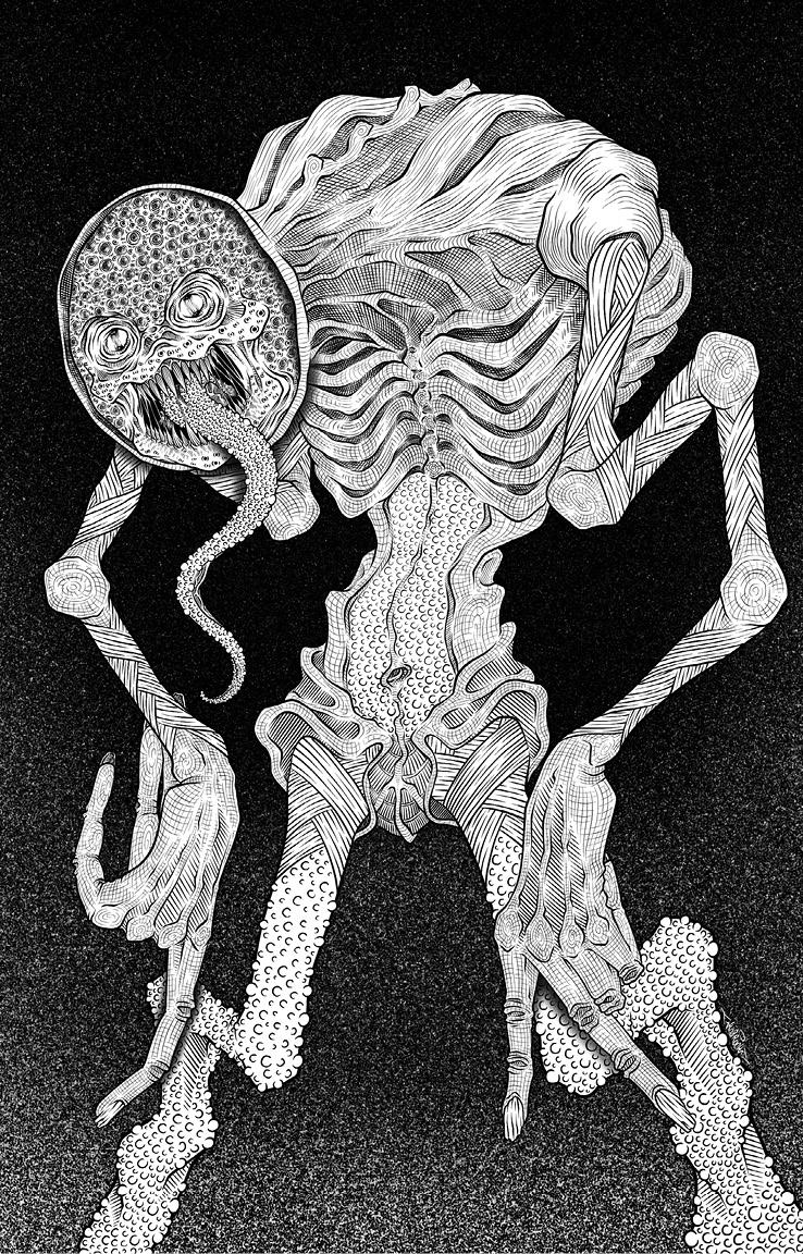 Существо это остановилось, развернулось в мою сторону и буквально впилось в меня глазами — белыми, с прыгающими зрачками (я даже не мог понять, сколько там зрачков, так стремительно они перемещались!). Затем оно затряслось, метнулось, сгибаясь на ходу, к столу, впилось в него руками и приблизило ко мне вплотную лицо, похожее на плоский блин, истыканный отверстиями. Из его горла вырвалось шипение. Его руки забегали по краю стола, словно вслепую пытались дотянуться до моих. В этот момент я застыл, словно неживой. Это не было страхом, клянусь! Это было чувство гораздо более сильное — и гораздо менее человеческое. Так создание одной природы застывает перед созданием иной природы; так дикий зверь не понимает, как следует относиться к автомобилю, и леденеет на месте; но только все эти чувства были в десятки раз сильнее. Передо мной как будто распахнулась бездна в неведомые миры, о которых человечество старается не думать, которые пытается не постигать. По сравнению с ними обычный космос выглядит почти деревенским угодьем; там — какая-то бесконечно далекая и абсолютно равнодушная к человеку с его потребностями и способностями вселенная… и тем не менее вот она, рядом, и я застрял на самом краю.