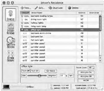 X-10 не требует наличия центрального процессора: каждое устройство получает индивидуальный адрес, по которому его найдет отправленная с пульта команда. И все же центральный процессор не повредит. Если у вас есть компьютер, вы можете использовать его в качестве такого устройства. Для связи компьютера с модулями X-10 существуют специальные программы (рис. 1.11). Интересно, что все время включенным компьютер держать необязательно: модули и так запомнят и выполнят необходимые команды. Телефон также можно включить в систему. В таком случае отдавать команды и получать информацию можно будет, просто позвонив по телефону.