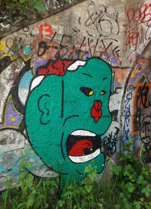 Но граффитистам отвели только «начальную» часть стенок речушки Нант дАвриль и соседний микро туннель, где зеленеет это изо-бражение… А дальше по течению Нанта = без граффити… И мы идём-бредём дальше, потому что в других местах прогулки БЕЗ поводка чреваты…