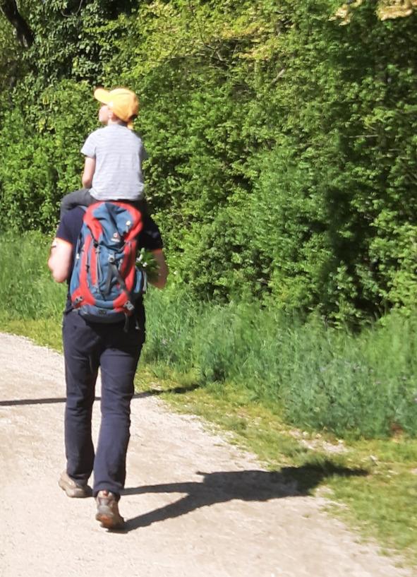 Первое мая = день ландыша во Франции, а также, похоже, и в Швейцарии. Все сетевые магазины продают ландыши живьём или срезанными букетиками, а народ толпами бродит в конце апреля и собирает их по лесочкам и лесопаркам. Вот и этот папаша несёт на своей шее парнишку (скорее всего сынишку), а из кармана рюкзачка выглядывает вполне себе приличный по количеству букетик свежесорванных ландышей. Он прошёл мимо, а запах после него до сих пор чувствуется…