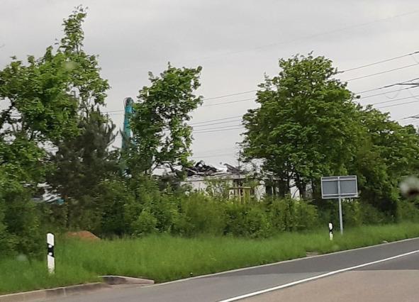 На фото почти не видно. Так что это, скорее, для себя напоминание: горел = якобы = сервис-центр Теслы в Мейране/Сатиньи, его остатки разбирают-ломают…